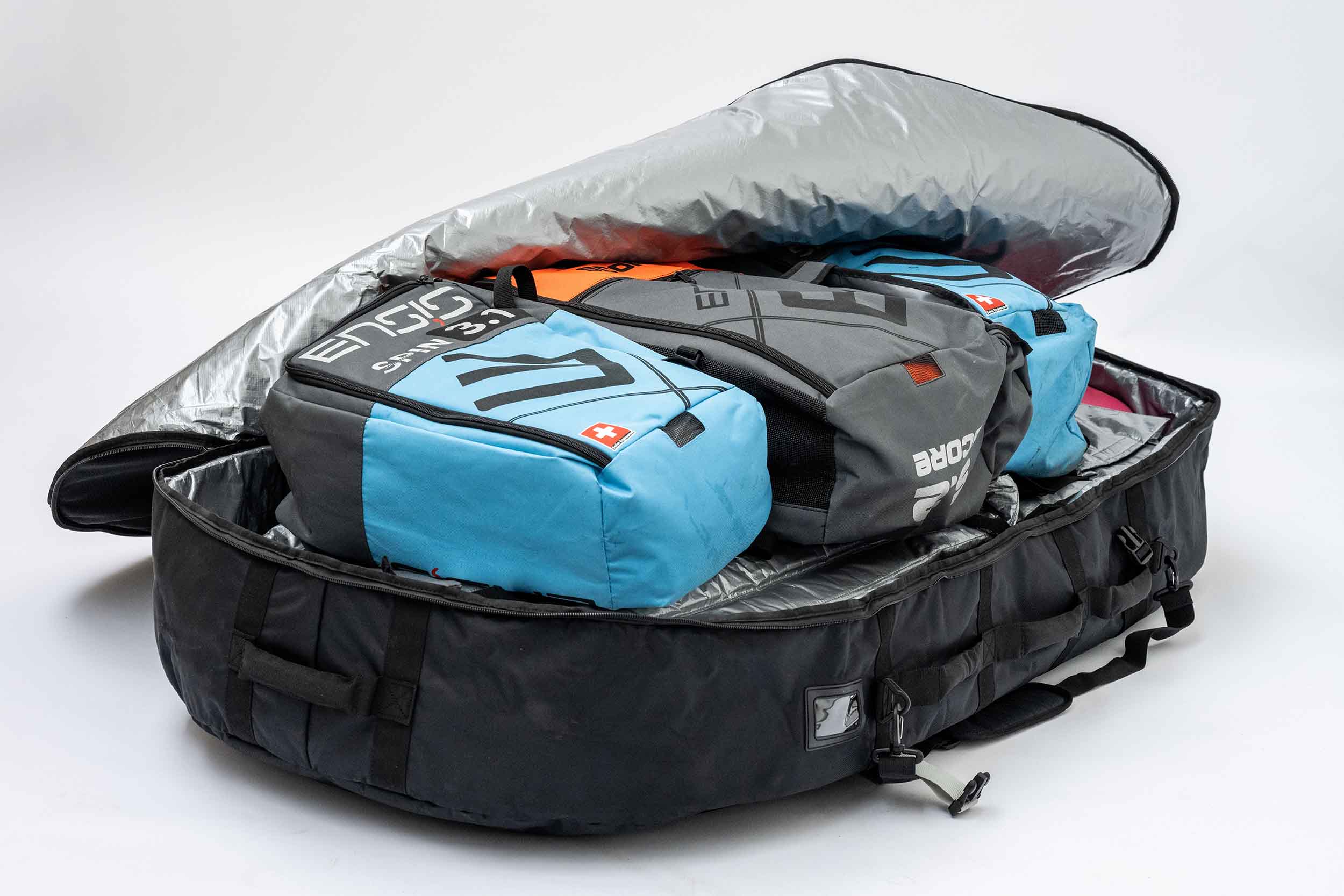 Full Gear Storage – Integrated padded foil leaf fits two front wings, three stabs, one mast, one fuselage, plus a mesh pocket for hardware—alongside space for 3–4 wings.